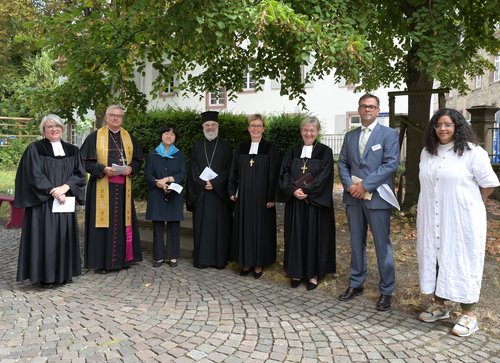 v.l.n.r. Pfarrerin Christine Gölzer, Bischof Karl-Heinz Wiesemann, Reverend EUN JEONG SON, Erzpriester Georgios Basioudis, Oberkirchenrätin Marianne Wagner, Kirchenpräsidentin Dorothee Wüst, Pfarrer Florian Gärtner, Mara Zöller