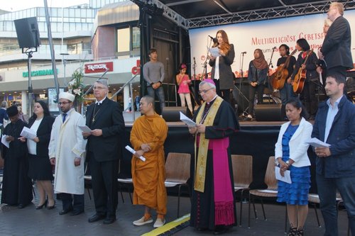 Mit einem Schriftwort und einen Bekenntnisgebet eröffneten Kirchenpräsident Christian Schad und Bischof Dr. Karl-Heinz Wiesemann die Gebetsfeier. Von christlicher Seite schlossen sich ein Friedensgebet, ein Lobpreis und ein Bittgebet an. Vertreter der eritreisch-orthodoxen sowie der griechisch-orthodoxen Gemeinde sprachen ihre Gebete auch in ihrer Heimatsprache. Desgleichen bestand der sunnitisch-muslimische Beitrag aus einer Koranrezitation, die auf deutsch und arabisch vorgetragen wurde, ebenso wie der buddhistische Beitrag in deutsch und sanskrit gehalten wurde. Auch die alevitische Gemeinde war mit einem Gebet vertreten.