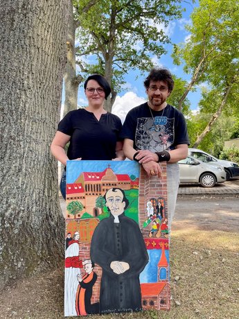 Caritas-Mitarbeiterin Kerstin Bettin ist von Wolfgang Armbrusts Arbeiten so begeistert, dass sie ihm den Auftrag gegeben hat, für das Caritas-Förderzentrum Paul Josef Nardini ein Bild von dem Namenspatron der Einrichtung zu malen.