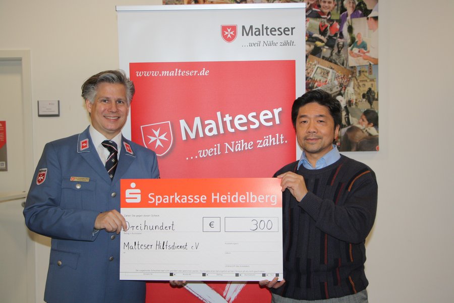 Ton-Vinh Trinh-Do, Bereichsleiter am sozial-psychiatrischen Förderzentrums der Caritas Ludwigshafen übergibt Dr. Wolf, Diözesanleiter der Malteser in Speyer den Spendenscheck für die Ukrainehilfe