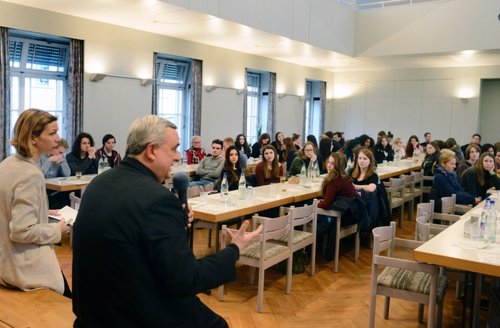 Zum Abschluss des Tages stellte sich Bischof Dr. Karl-Heinz Wiesemann den Fragen der Jugendlichen und stand ihnen auch zu kontroversen Themen wie die Haltung der Kirche zur Homosexualität und gleichgeschlechtlichen Partnerschaften oder zum Thema Scheidung und Priesteramt für Frauen in der katholischen Kirche Rede und Antwort. „Es gibt keinen anderen Weg, als wieder mehr über unseren Glauben zu reden“, ermunterte der Bischof die Schülerinnen und Schüler bei der Frage, wie man der Entwicklung gegensteuern könne, dass immer mehr Menschen die Kirche verlassen. „Unsere Aufgabe besteht darin, dass wir zeigen, dass der Glaube für das Leben eine positive Qualität hat.“ Und zur Frage, wie man Menschen begegnen kann, die eine schwere Schuld auf sich geladen haben, gab Bischof Wiesemann am Ende des Gesprächs den Jugendlichen mit auf den Weg: „Barmherzigkeit bedeutet die grundlegende Bereitschaft, dem Menschen eine zweite Chance zu geben.“