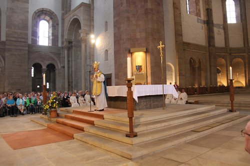 Speyer. Der 15. August ist im Bistum Speyer ein besonderer Tag. Gefeiert wird das Hochfest Mariä Aufnahme in den Himmel, das Patronatsfest des Speyerer Doms und des Bistums. Bischof Dr. Karl-Heinz Wiesemann zelebrierte in der vollbesetzten Speyerer Kathedrale aus diesem Anlass ein Pontifikalamt. Eine besondere Begrüßung gab es für eine Pilgergruppe, die in an einer erstmals durchgeführten, nächtlichen Wallfahrt von der St. Anna Kapelle bei Burrweiler zum Dom teilgenommen hatte und nun mit in den Dom einzog.