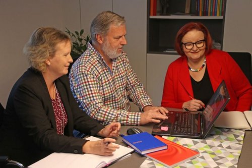 Das Kuseler Internetredaktionsteam bei der Arbeit – von links Pfarrsekretärin Tina Schultheiß, Gemeindereferent Michael Huber und Pfarreirats-Vorsitzende Christa Kuhn.
