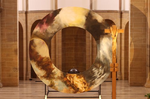 Landau. Von Aschermittwoch bis Ostern ist in der Landauer Marienkirche ein Ringgemälde der Landauer Künstler Christine Schön und Mario Frieske zu sehen, dass die Besucher/innen zum Betrachten und Meditieren einlädt. Inspiriert wurden die beiden Künstler durch den Sonnengesang des Hl Franz von Assisi. Das Ringgemälde stellt die Themen Gestirne, Wind, Wasser, Feuer, Erde, Liebe, Tod und Sonne dar.