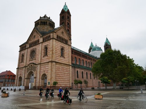 Speyer. Wind und Wetter trotzend brachen am Morgen des 5. Oktober fünf Baufachleute vom Dom zu Speyer aus auf, um mit Straßburg die nächste Etappe ihrer gemeinsamen Fahrradtour anzusteuern. Mit dieser gemeinsamen Reise, die in Xanten ihren Anfang nahm, möchten sie für die Anerkennung der Bauhütten als immaterielles Weltkulturerbe werben. Die Tour der Baumeister führt über sieben Stationen auf 700 Kilometern von Xanten, über Köln, Koblenz, Mainz, Speyer, Straßburg und Freiburg zur Dombaumeistertagung in Basel. An den verschiedenen Orten wurden jeweils die dortigen Bauhütten beziehungsweise historische Bauwerke besucht. In Speyer wurden sie von Dombaumeisterin Hedwig Drabik begrüßt, die ihnen den Dom und seine Baustellen zeigte – und abschließend noch ein Stück des Wegs begleitete.