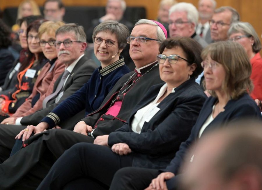 Margret Klein-Magar mit (vierte von rechts) hielt den Festvortrag zur Feier des 20. Geburtstages der Bischöflichen Stiftung Mutter und Kind. Rechts daneben sitzen Bischof Wiesemann, Marlies Kohnle-Gros und Ulrike Gentner.