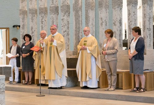 Bischof Dr. Karl-Heinz Wiesemann hielt den Festgottesdienst, den die Gemeindereferenten zum Großteil gestalteten. Ihren Tag hatten die sie unter das Motto „Mittendrin“ gestellt. Im Gottesdienst spürten sie nach, was es bedeutet, „mittendrin“ zu sein. Einige meldeten sich zu Wort und machten deutlich, dass „mittendrin“ sowohl den ganz gewöhnlichen Alltag, aber auch besonders herausfordernde und kräftezehrende Situationen betrifft. Sie zeigten auf, in wie vielen Bereichen sie mittendrin sind: als Seelsorger im Krankenhaus, bei der Polizei, in der Schule oder in den Pfarreien. Gemeindereferenten teilen Freude und Lachen, aber auch Sorgen, Ängste und Nöte. Sie geben den Menschen Halt, stehen ihnen bei und versichern ihnen Gottes Gegenwart. Eine Stimme bezeichnete die Gemeindereferenten als die Schmuckstücke der Kirche. Eine andere bedauerte, weniger Zeit für persönliche Kontakte zu haben.