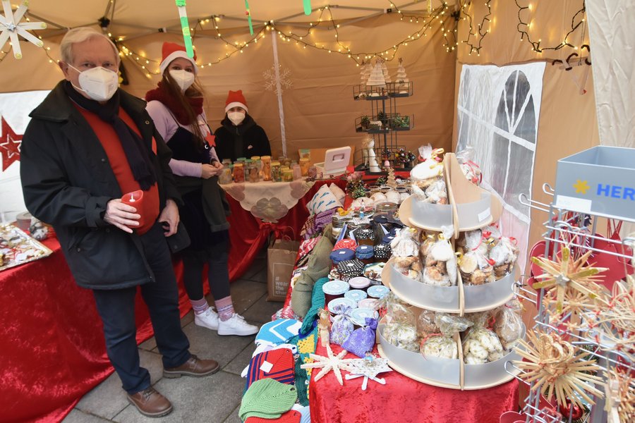 Frankenthal. Der Duft von frisch gebackenen Waffeln, heißem Glühwein und Punsch kitzelt die Nase, es gibt kleine Stände, wo schöne Bastelsachen, Gebäck, Kissen und Kerzen angeboten werden, Weihnachtslieder erklingen – und das alles passiert im Hof des Caritas-Altenzentrums Heilig Geist. Gut eingemummelt in warme Kleidung, von innen gewärmt mit einem heißen Getränk haben Senioren und ihre Angehörigen viel Freude. Gerade stellt sich ein Chor von jungen Leuten auf und singt sehr schöne Kirchenlieder, die von der Ankunft des Herrn künden. Die Weihnachtsmarkt-Atmosphäre ist perfekt, allen Leuten ist die Freude anzumerken.