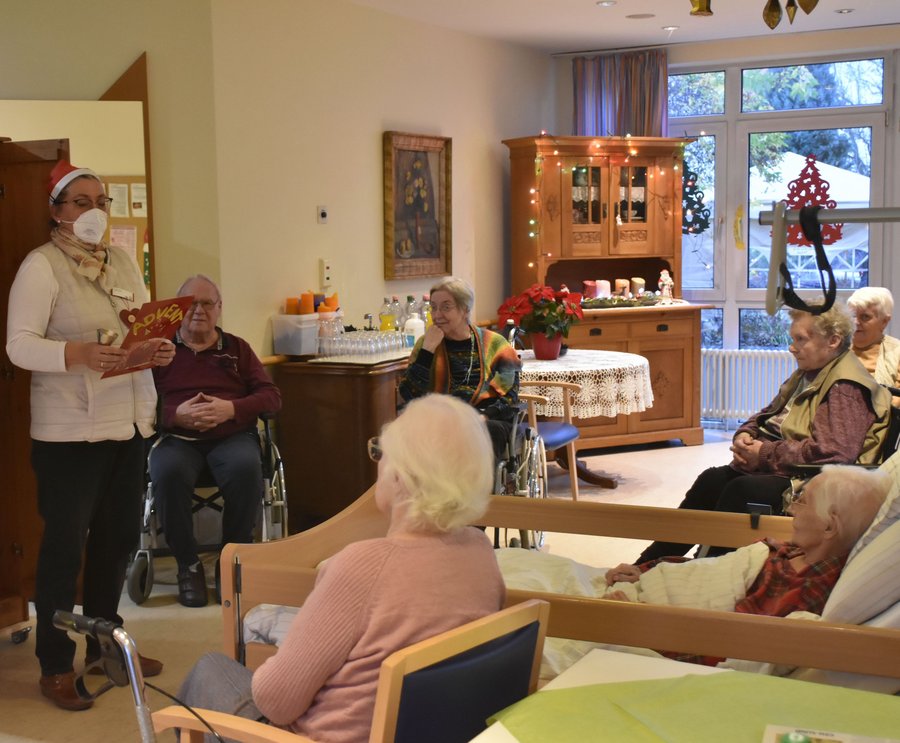 Auch für die Menschen, die nicht nach draußen können, gibt es ein Programm. Eine pfiffige Idee ist der rollende Adventskalender: Das ist ein großer Schrank mit Türen, die man öffnen kann, auf denen das Datum klebt. Jeden Tag bekommt die Schranktür ein neues Datum und der Schrank eine neue „Füllung“. Gerade rollt Sigrun Sauter, die Leiterin des Sozialdienstes, den Adventskalender-Schrank in einen Gruppenraum im Erdgeschoß. In Rollstühlen und Betten sind die ZuhörerInnen versammelt und schon ganz gespannt. Sigrun Sauter öffnet die Schranktüren und holt ein hübsch geschmücktes Blatt mit einem Gedicht. Ein Strahlen geht über die Gesichter, als sie beginnt mit „Von draußen, vom Walde komm ich her...“ Es macht den Senioren Freude, Textzeilen mitzusprechen, oder zu ergänzen, wenn Sigrid Sauter dafür extra eine Lücke lässt. Nach dem Gedicht nimmt die Pianistin Uli Gilcher ihre Querflöte und spielt Weihnachtlieder, die manche mitsingen oder -summen. Zu Weihnachten gibt es für jede Station eine eigene Weihnachtsfeier, so dass alle Bewohner sicher und geschützt das Fest der Freude feiern können.