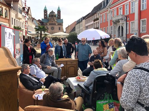 Im Zimmmer auf der Straße diskutierten Passanten, Vertreter von Hilfseinrichtungen, Caritas-Mitarbeiter, der amtierende Speyerer Obebürgermeister Hansjörg Eger und seine Nachfolgerin Stefanie Seiler sowie weitere politische Vertreter miteinander das Problem der Wohnungsnot und seine Folgen