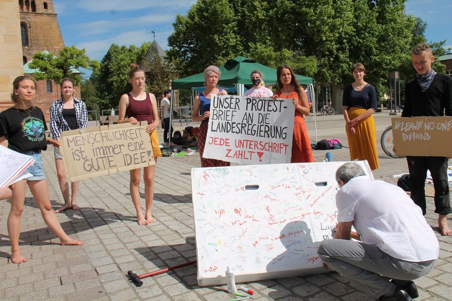 „Das Engagement der jungen Menschen, die sich gegen die inhumanen Zustände auf der griechischen Insel Lesbos einsetzen, weitet unseren Blick. Gerade auch weil uns die Coronakrise stark selbst beschäftigt, ist diese Solidarität wichtig, zu der wir auch als Christen berufen sind. Die Menschen im Lager haben nicht einmal genug Wasser, um sich die Hände zu waschen. Sie sind perspektiv- und hoffnungslos, es sind kaum Ärzte da“, erklärte Bischof Wiesemann. „Mitten in Europa sterben diese Flüchtlinge unter menschenunwürdigen Zuständen. Die Flüchtlingskrise geht weiter und diese Menschen sind zu uns gekommen, weil sie vor Krieg und Gewalt geflohen sind. Wir sollten wenigstens versuchen, die Kinder und die Jugendlichen aufzunehmen. Es ist großartig, dass die jungen Menschen hier in Speyer auf dem Domplatz mit großen Engagement darauf aufmerksam machen“, lobte der Bischof.
