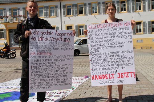 „Wir sind hier, weil wir unsere Forderungen direkt zur Landesregierung bringen wollen“, erklären die beiden Aktivisten Clara und Bjarne. Die Situation in den Flüchtlingslagern sei katastrophal. „Wir wollten nicht länger zusehen.“ Zu Beginn ihrer Protestaktion hatten die Aktivisten aus Landau mit einem Hungerstreik, der mit einer Mahnwache auf dem Rathausplatz der südpfälzischen Stadt verbunden war, auf ihre Forderungen aufmerksam gemacht. „Aber darauf haben wir keine Reaktion von der Politik bekommen, deshalb machen wir jetzt den Protestmarsch“, so die beiden jungen Vertreter der Gruppe „Coloured Rain“.