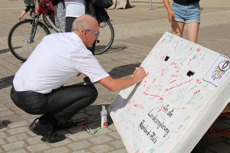 Bischof Dr. Karl-Heinz Wiesemann und Kirchenpräsident Christian Schad nahmen sich am Nachmittag Zeit, um mit den Aktivisten zu sprechen. Sie bekundeten ihre Wertschätzung und ihre Unterstützung für die Forderungen der jungen Menschen und zollten ihnen Respekt und Dank für ihr Engagement.