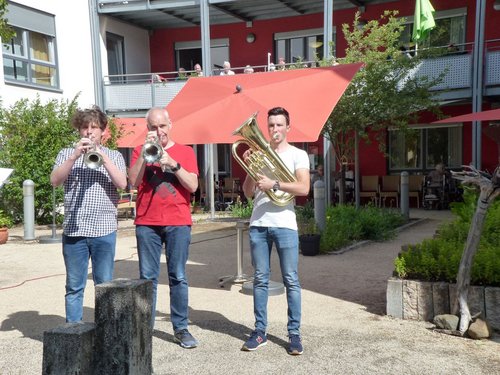 „Die kleine Kneipe in unserer Straße“ – Trompeten lassen die Klänge des Dauerbrenners von Udo Jürgens durch die Leipziger Straße wehen. Es ist Pfingstsonntag und Zeit für ein Ständchen. Das ist seit gut zwei Monaten zu einer geliebten Tradition geworden. An Sonn- und Feiertagen geben Musiker pünktlich um 10.30 Uhr ein Konzert. Im Garten von St. Hedwig und in sicherer Distanz zu den Bewohnern und Bewohnerinnen, die sich auf den Balkonen und der Terrasse versammelt haben. An diesem Tag liegt die musikalische Kurzweil in den Händen eines Trios des Kolpingblasorchesters Kaiserslautern, das mit Trompeten, Euphonium, Flügelhorn und technischem Gerät angerückt ist.
