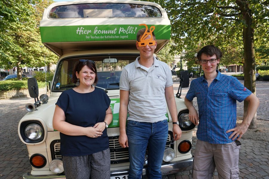 Speyer/Bad Dürkheim. Am 6.8.18 machte der BDKJ Tourbus Polli in Bad Dürkheim auf dem Bahnhofsvorplatz halt. Anlass war ein jugendpolitisches Gespräch mit Johannes Steiniger, Mitglied des Bundestages (CDU). Die katholische Jugend hatte eingeladen. Das Gespräch führten Lena Schmidt, Diözesanvorsitzende des Bundes der Deutschen katholischen Jugend (BDKJ Speyer) und Tobias Kraus, BDKJ-Referent für den Tourbus Polli. Gespräche des Dachverbandes der katholischen Jugendverbände mit Politikern aus der Pfalz finden regelmäßig statt. Sie stehen unter dem Motto „u28- Die Zukunft lacht“. In den Gesprächen bekommen die Politiker eine „U28-Brille“ aus orangenem Pappkarton, die sie sinnbildlich in die Lage versetzen soll, die Perspektive von Kinder und Jugendlichen in politischen Entscheidungsprozessen einzunehmen.