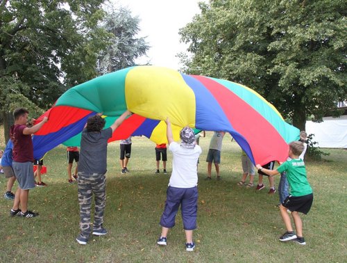 Vormittags verbringen die Kinder in Gruppen - zehn gibt es insgesamt - , aufgeteilt nach Alter und Geschlecht. Darius aus Wörth versucht gerade mit seiner Gruppe einen Ball auf einem großen bunten Schwungtuch in die Luft zu katapultieren. „Ich bin schon zum vierten Mal dabei, weil es so viel Spaß macht“, erzählt der Zehnjährige. Vor ein paar Tagen sei die Gruppe im Maislabyrinth gewesen. „Wir mussten sechs Stempel dort finden“, erklärt Darius. Aber am liebsten spielt er Fußball, trotz Hitze.