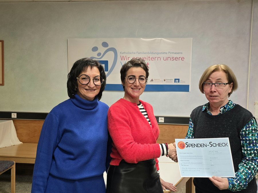 Die Freude bei Uta Facco, Leiterin der Katholischen Familienbildungsstätte in Pirmasens und Uta Stutterich-Wilhelm, die das Trauercafé Himmelslichter leitet, war groß, als Rita Höfer (von links) die Kollekte der Feier der Ehejubiläen überreichte. Für die Teilnehmer des Trauercafés bedeute das auch, dass sie wahrgenommen werden, nicht alleine sind, sagte Stutterich-Wilhelm. © Andrea Daum