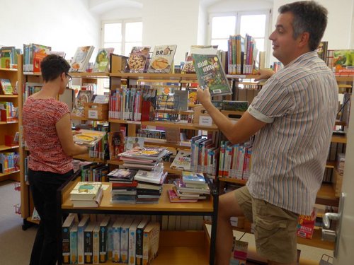 Die ehrenamtlichen Büchereileiter Silke und Ulf Weber suchten in der Ergänzungsbücherei des Bistums Speyer Titel aus, die nun für ein halbes Jahr zusätzlich zum eigenen Bestand in der Leimersheimer KÖB zur Ausleihe bereit stehen. Mit dem so genannten „Blockbestand“ werden alle Bestandsbereiche der Kath. Öffentl. Bücherei um weitere Titel ergänzt: So ist das attraktive Angebot der KÖB nicht nur um Romane, Ratgeber, Bilder-, Erstleser-, Kinder- und Jugendbücher, sondern auch um zusätzliche Comics, Hörbücher, Kinder-CDs, Brettspiele und DVDs „über Nacht“ aufgestockt worden. Mit dabei ist eine kleine Auswahl aktueller Koch- und Backbücher zum Thema Sommerküche. Die 400 „Blaupunkt“-Titel aus der Ergänzungsbücherei stehen nun zusätzlich zur kostenlosen Ausleihe bereit. Durch einen blauen Punkt auf dem Buchrücken können die Buchblock-Medien von Lesern und Mitarbeitern leicht vom eigenen Bestand unterschieden werden.
