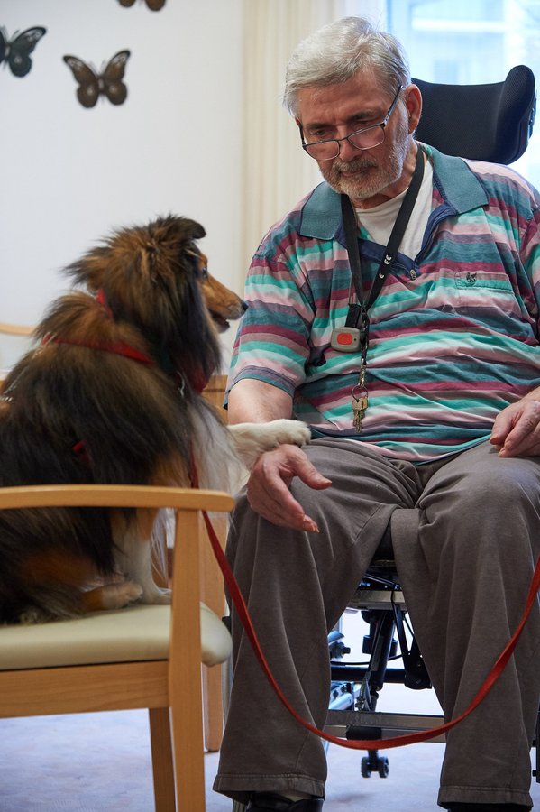 Mathias Kloiber leitet den Besuchdienst mit Hund im Kreis Germersheim: „Unsere Besuchshunde haben es während ihrer Ausbildung gelernt sich ihrer Umgebung und den Menschen anzupassen. Durch den zwanglosen Kontakt mit dem Hund fällt es leichter Barrieren abzubauen. Sie sind empathisch, schenken Trost und sind für viele eine willkommene – oft die einzige Abwechslung.“ Ein erstes Kennenlernen in der Einrichtung findet meist bei einem kurzen Besuch auf dem Zimmer oder im Stuhlkreis statt, bei dem der Hund gestreichelt oder mit Leckerlies gefüttert werden darf. „Manchmal kommt man auch über den Hund mit anderen Bewohnerinnen im Haus ins Gespräch oder kann selbst bei Demenzerkrankten, die normalerweise nicht sprechen, eine Reaktion hervorrufen.“ berichtet Kloiber. Besonders an ein Erlebnis erinnert er sich sehr gerne zurück: „Ich hätte nie gedacht, dass es das gibt - eine Frau im Wachkoma begann gerührt zu weinen, nachdem sich einer unserer Besuchshunde zu ihr aufs Bett gelegt hat. Ein wunderbarer Moment und eine Bestätigung für unsere ehrenamtliche Arbeit!“