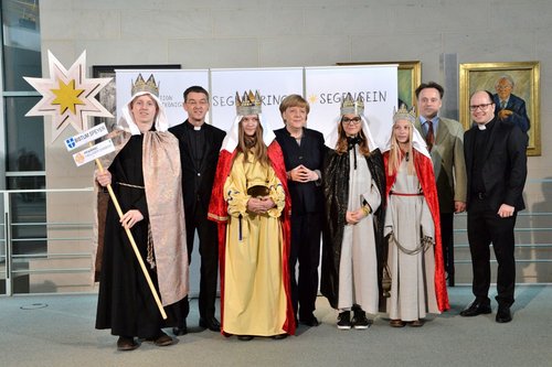 Jeweils vier Sternsinger aus allen 27 deutschen Bistümern vertraten in Berlin alle Mädchen und Jungen, die sich rund um das Dreikönigsfest bundesweit an der 59. Aktion Dreikönigssingen beteiligen. Seit 1984 bringen die Sternsinger jedes Jahr ihren Segen „Christus mansionem benedicat – Christus segne dieses Haus“ ins Bundeskanzleramt. Bundeskanzlerin Angela Merkel hieß die kleinen und großen Könige bereits zum zwölften Mal willkommen.
