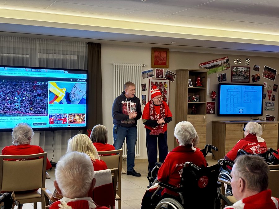 Aktuell sieht es in Sachen Fußball bei den Roten Teufeln gut aus. Erst der Auswärtssieg gegen Schalke 04, eine Woche später dann der Derby-Sieg gegen den Karlsruher SC auf dem heimischen Betzenberg. „Dann machen solche Termine natürlich viel mehr Spaß“, erzählt Heimleiter Thomas Matz lachend. Es ist wieder Dienstag, der Tag, an dem sich die Mitglieder des Fanclubs „Die luschdische alde Deiwel“ im Foyer des Heims treffen, das vergangene Spiel per Zusammenfassung diskutieren und einen Ausblick auf die nächste Saison wagen.