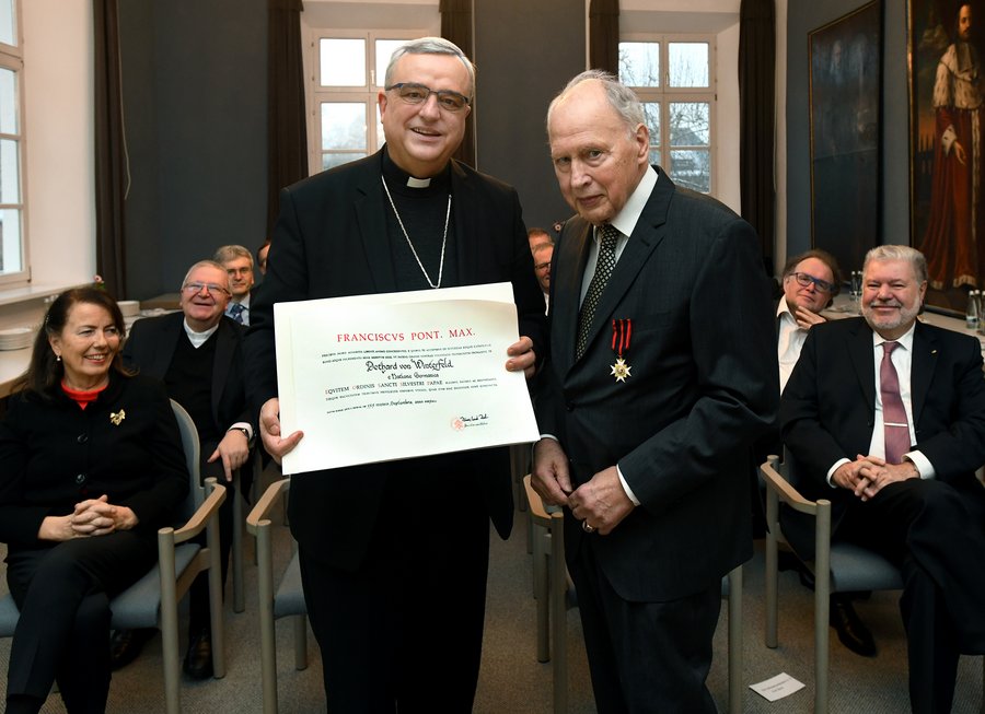 Speyer. In Würdigung der großen Verdienste um den Speyerer Dom wurde Professor Dr. Dethard von Winterfeld der Orden des heiligen Papstes Silvester (Silvesterorden) in der Klasse "Cavaliere / Ritter" verliehen. Bischof Dr. Karl-Heinz Wiesemann übergab die Urkunde mit der Unterschrift von Papst Franziskus und den dazugehörigen Orden am 11. Januar an den renommierten Kunsthistoriker.