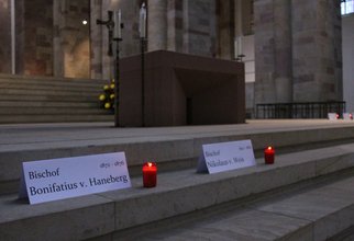 Rote Grablichter und Namensschilder erinnern an die im Dom zu Speyer bestatteten Bischöfe – Besondere Führung am Abend von Allerheiligen