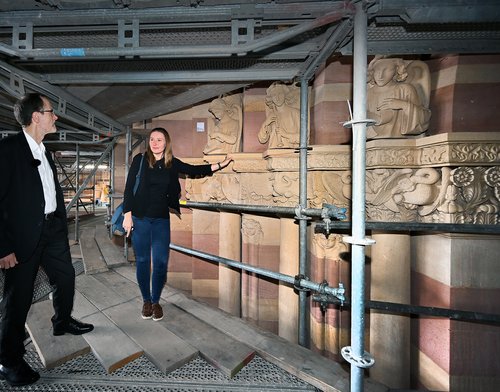 Speyer. Einen Einblick in den aktuellen Stand der Bauarbeiten in der Vorhalle des Doms gaben am Mittwoch, 14. August, Domdekan und Domkustos Dr. Christoph Kohl und Dombaumeisterin Hedwig Drabik. Die Maßnahme betrifft alle sichtbaren Flächen der Vorhalle, Gewölbe, Reliefs und Skulpturen. Die Vorhalle ist daher seit Beginn des Jahres komplett eingerüstet, so dass von den Arbeiten normalerweise nichts zu sehen ist. Nun gab es einen Blick hinter die Kulissen.