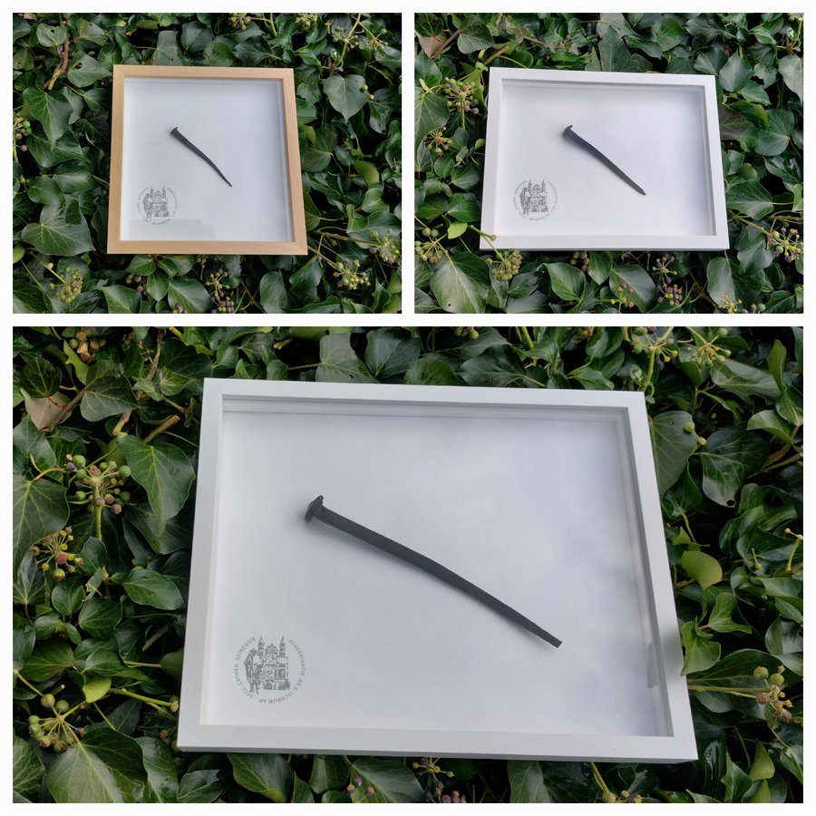 Die handgeschmiedeten Domnägel sind mit wertigen Rahmen aus weißem oder naturbelassenem Lindenholz versehen und können - ausgestattet mit einem Echtheitszertifikat - in drei Größen erworben werden: