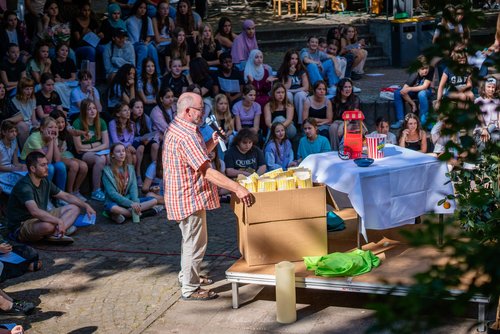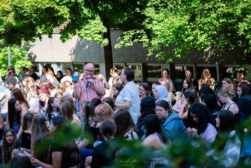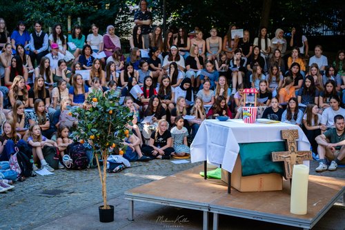 Matthias Lambrich und Dr. Thomas Klöckner hatten den ökumenischen Gottesdienst unter das Thema "Popcorn-Challenge" gestellt. Es wurden Popcorn-Momente und -Erlebnisse geteilt, in denen man sich bewusst für das Christsein entschieden hat. Gemeinsame Lieder schallten über den Schulhof. Eine Gruppe der MSS 12 stellte sich der Herausforderung, einen Rap vorzutragen. Nach dem Segen gab es Popcorn für alle, vorbereitet von der AG House of One.