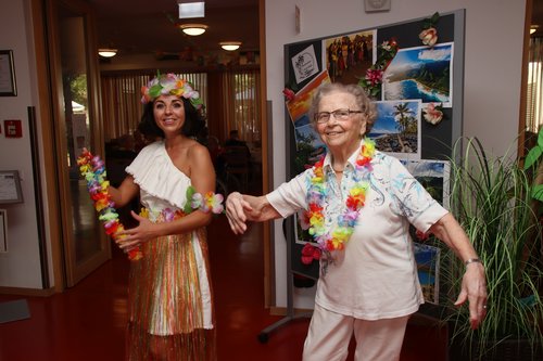 Beim Betreten der Caféteria bekamen die Bewohner eine Blumenkette um den Hals gelegt. Für die 92-jährige Irma Bentz ist das mit einer besonders schönen Erinnerung verbunden, denn das hat sie schon einmal erlebt: „Ich habe mit meinem Mann 1978 eine Studienreise zu den Nationalparks an der Westküste der USA gemacht. Am Ende haben wir in einem Reisebüro noch fünf Tage Hawaii gebucht. Wir haben viel gesehen dort, es war wunderschön“, erzählt sie und freut sich über das Motto des diesjährigen Sommerfestes. Damit hat Kirstin Fischer, die Bereichsleiterin Sozialer Dienst, gar nicht gerechnet, eher damit, dass die Bewohner es mit der Krimi-Serie Magnum oder der Hula-Hoop Welle in den 1970er Jahren in Verbindung bringen. „Wir überlegen uns jedes Jahr, wie wir den Bewohnern mit dem Sommerfest eine Freude machen können“, erzählt sie. In diesem Jahr habe man sich für das Thema Hawaii entschieden, um etwas von der Begrüßungskultur im tropischen Inselparadies und der Lebensfreude der Hawaiianer nach St. Elisabeth zu bringen.