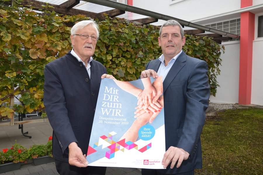 Bonifatiuswerk-Geschäftsführer Ingo Imenkämper (rechts) und Präsident Heinz Paus präsentieren das Leitmotiv zur bundesweiten Diaspora-Aktion 2022.