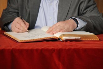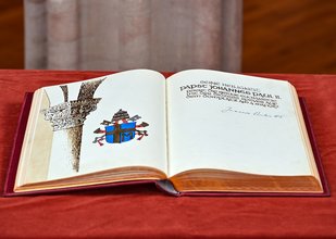 Der wohl berühmteste Dombesucher: Papst Johannes Paul II. unterschrieb bei seinem Besuch des Doms im Jahr 1987 im Goldenen Buch © Domkapitel Speyer, Foto: Klaus Landry