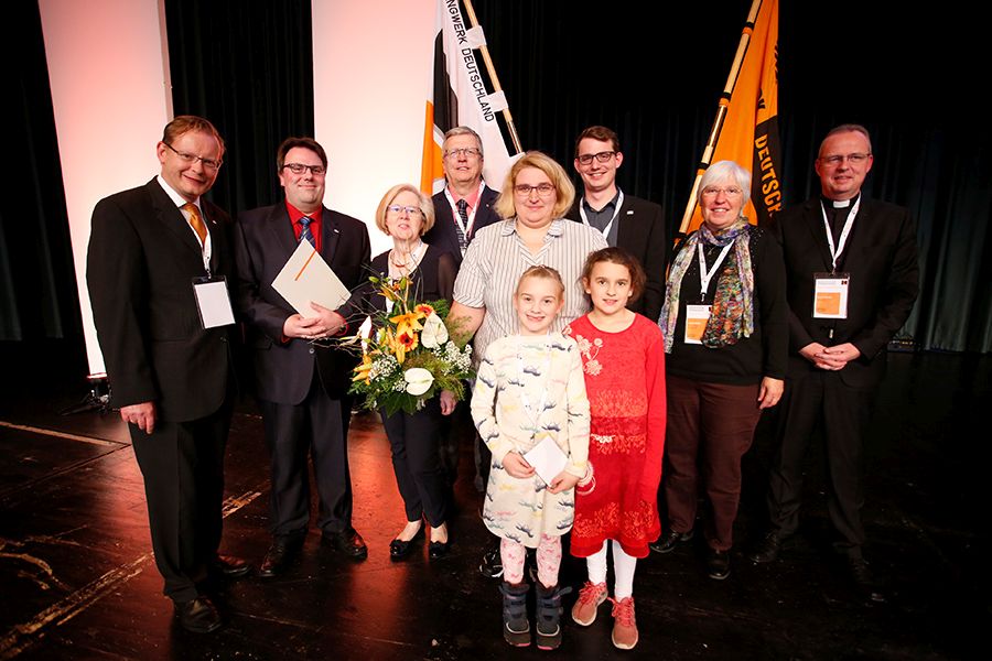 Nach der Verleihung des Ehrenzeichens: (v.l.n.r.) Bundesvorsitzender Thomas Dörflinger, Harald Reisel, Stv. Bundesvorsitzende Klaudia Rudersdorf, Diözesanvorsitzender Andreas Stellmann, Ehefrau Karin Reisel und die gemeinsamen Töchter, Stv. Bundesvorsitzender Manuel Hörmeyer, Geistliche Leiterin des Bundesverbandes Rosalia Walter und Bundespräses Pfarrer Josef Holtkotte.