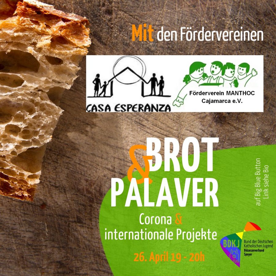 Am Montag, den 26. April sollen zwei Projekte, für die der Bund der Deutschen Katholischen Jugend (BDKJ) Speyer anerkannte Entsendeorganisation ist, bei der Veranstaltung „Brot & Palaver“ im Mittelpunkt stehen. Eingeladen sind Vertreterinnen und Vertreter der Fördervereine MANTHOC und Casa Esperanza, um über die Auswirkungen der Corona-Pandemie auf die Arbeit vor Ort zu berichten.
