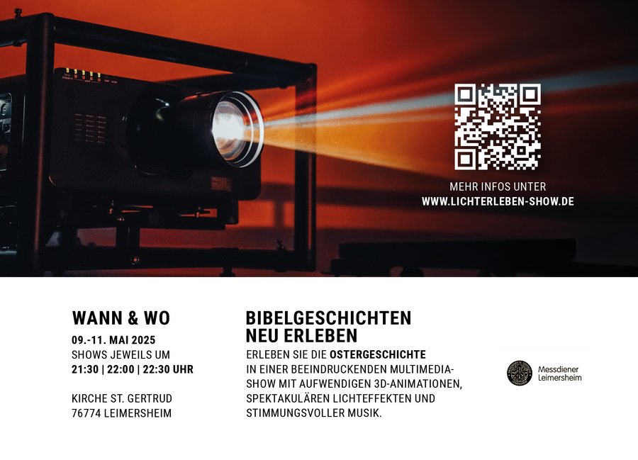 Vom 09.-11. Mai 2025 wird die Leimersheimer Kirche erneut mit unzähligen Scheinwerfern und mehreren Hochleistungsbeamern in ein beeindruckendes Licht getaucht. Die aufwendig erstellten Animationen, die auf die große Fläche über dem Altarraum projiziert werden, erzählen die biblischen Geschichten von der Auferstehung Christi, seiner Himmelfahrt und der Sendung des Heiligen Geistes auf mitreißende Weise. An jedem der drei Abende wird das rund 15-minütige Spektakel drei Mal hintereinander aufgeführt.