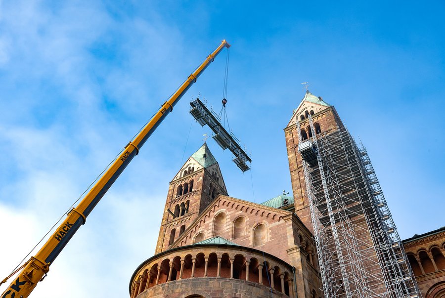 Bauingenieur Dölz hat bereits am Schloss Neuschwanstein und der Drachenburg bei Königswinter gearbeitet. „Der fast 1000 Jahre alte Speyerer Dom verlangt einem dennoch besonderen Respekt ab“, sagt er. „Es ist schon eine Auszeichnung, wenn man hier arbeiten darf.“ Die Zahlen die er nennt klingen sehr beeindruckend: 4,5 Tonnen wiegen die beiden Stahlträger, welche eine 18 Meter lange Brücke zwischen den beiden Osttürmen spannen. Diese Verbindung ist notwendig, damit Arbeiter und Material vom Nordostturm auf den Südostturm gelangen können. Weitere Stahlträger ragen aus den Fenstern des Südosturms. Auf diesen hat der Kran am frühen Morgen des 23. Oktober ein großes Gerüstteil aufgesetzt. Besonderes Fingerspitzengefühl war hier beim Kranführer der Firma Hack gefragt. Nur 1,5 Meter trennten zeitweise die durch die Luft schwebenden Gerüststangen und die Turmhaube des Vierungsturms.