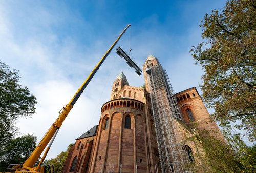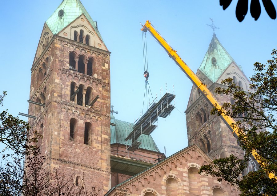 Speyer. 70 Meter ragen die Osttürme des Speyerer Doms in den Himmel. In den kommenden Jahren sollen sie saniert werden. Damit das möglich ist, müssen zunächst Gerüste gestellt werden. Dazu ist derzeit ein Teleskopkran im Einsatz, welcher bereits am Boden vormontierte Gerüstteile in große Höhen transportiert. In einem Medientermin erklärten Dombaumeisterin Hedwig Drabik und Andreas Dölz, der Bauleiter der ausführenden Gerüstbaufirma Fleck, welche Herausforderungen mit dem Stellen eines Gerüsts am Dom verbunden sind.