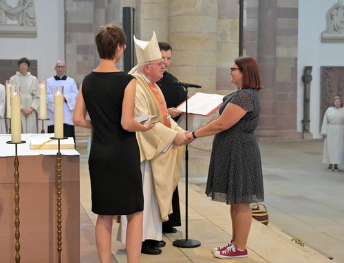 Speyer. In einem feierlichen Gottesdienst wurden die Gemeindereferentinnen Nicole Gajos und Alina Menzel, am Sonntag, im Dom zu Speyer, von Weihbischof Otto Georgens offiziell in den seelsorglichen Dienst des Bistums Speyer ausgesandt. Die beiden Gemeindereferentinnen werden zum 1. August ihre neuen Stellen antreten: Gajos wird künftig in der Pfarrei Dahn Hl. Petrus tätig sein, Menzel in der Pfarrei Wörth Hl. Christophorus. Der „Bestimmungsort, die Destination, das Ziel“, seien laut Georgens nicht nur geographisch zu verstehen. Er appellierte daran, als „Macher“ an einer erfolgreichen Kirche mitzuwirken. Trotz zahlreicher Herausforderungen gelte: „Lasst die Freude nicht zu kurz kommen!“