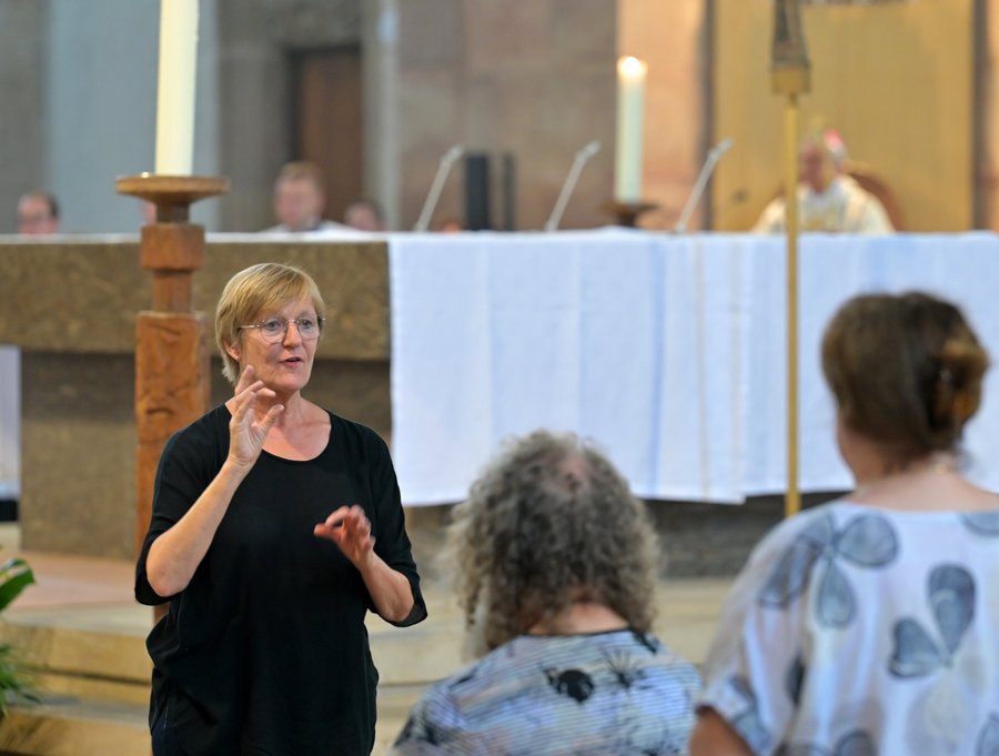 „Maria leuchtet vom Himmel als Zeichen der Hoffnung der Schöpfung und Vollendung und nicht zur Vernichtung“ begrüßte Bischof Dr. Karl-Heinz Wiesemann alle Gläubigen, die zur Messfeier des Pontifikalamts am Vormittag in den Dom gekommen waren und diesen bis auf den letzten Platz füllten. Ein besonderer Gruß galt einer Gruppe von etwa hundert Pilgerinnen und Pilgern, die am Vorabend bei der Annakapelle in Burrweiler gestartet und die Nacht über zum Dom gewandert waren. Eine weitere Besonderheit war heute, dass das Pontifikalamt auch für gehörlose und schwerhörige Menschen in Gebärdensprache simultan übersetzt wurde.