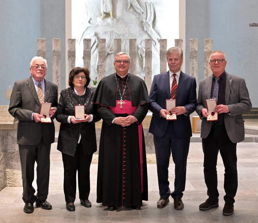 Speyer. Vier verdiente Persönlichkeiten hat Bischof Karl-Heinz Wiesemann am 24. November – dem Christkönigssonntag – im Auftrag des Papstes für ihren Einsatz für Kirche und christlichen Glauben gewürdigt. Eine Frau und drei Männer erhielten im Priesterseminar St. German in Speyer den Orden des heiligen Papstes Silvester verliehen. "Heute darf ich im Auftrag unseres Papstes Franziskus Menschen aus unserem Bistum, die Herausragendes geleistet haben, auszeichnen“, sagte Dr. Wiesemann. Der Speyerer Bischof bekannte eine gewisse innere Anspannung: „Ich mache das nicht sehr häufig, und es ist etwas Besonderes. Ich freue mich wirklich sehr, vier Menschen zu ehren. Vier Menschen, die es wert sind, dass man ihr zum Teil jahrzehntelanges Engagement unter dem Scheffel hervorholt, wo alle vier es gerne in christlicher Bescheidenheit verstecken.“