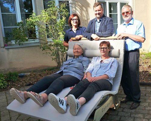 Entscheidenden Anteil an der Umsetzung des Projektes hatten die zahlreichen, eingehenden Spenden der Angehörigen von Frau Gabriele Buch. Sie verstarb im Februar und hatte verfügt, dass die Trauernden statt Blumen und Geldzuwendungen an die Werner-Lehr-Seniorenstiftung (IBAN DE93 5485 0010 1000 0538 41 bei der Sparkasse Südpfalz) spenden sollten. „Wir sind sehr dankbar für diese tolle Schenkung!“, begeisterte sich auch Sebastian Wagner, der Einrichtungsleiter, für die Wiege-Liege und probierte sie gleich selbst aus. Auch von den im Hause tätigen indischen Ordensschwestern bekam das neue Gerät ein „Daumen hoch“ nach einem Probeliegen nach getaner Gartenarbeit.“ Auch die Bewohnerinnen und Bewohner des Altenzentrums, wie Frau Marianne Reinhardt, haben die Wiegeliege schnell für sich entdeckt.