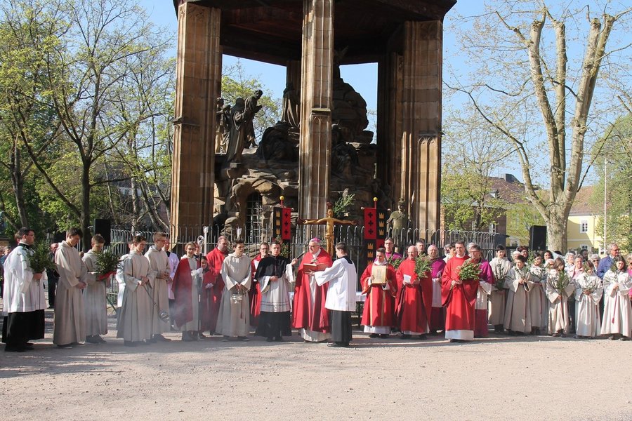 Der Gottesdienst begann mit einer Statio am Ölberg auf der südlichen Seite des Doms. Anschließend zog die Gemeinde in einer feierlichen Prozession durch den Domgarten. In seiner Begrüßung hatte der Bischof darauf hingewiesen, dass am Palmsonntag die Gläubigen mit Christus in die Heilige Stadt Jerusalem einziehen und dass der Dom selbst ein Abbild dieser heiligen Stadt sei.