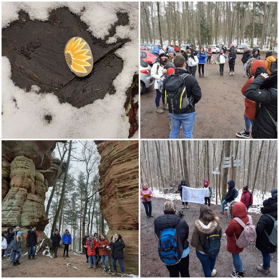 Nach einer Andacht zur Einstimmung auf das Thema „Schritte für Klimagerechtigkeit“, bei der Dr. Monika Bossung-Winkler, Referentin für Misereor und Globales Lernen, das Hungertuch der Chilenischen Künstlerin Lilian Moreno Sánchez in der Pfarrkirche St. Stephanus in Trulben vorstellte und einen ersten Impuls zum Thema „Brüche aushalten“ gab, machte sich die Gruppe unter der Leitung von Birgitta Greif auf den Weg zu den Altschlossfelsen nach Eppenbrunn.