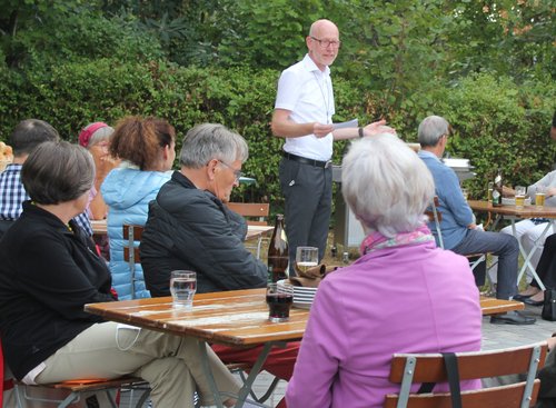 An den Tischen tauschten sich die Menschen eifrig aus. Sie fanden positive Seiten des Lebens während des „Lock-downs“, die Gemeinschaft innerhalb der Familie, die Muße für Spaziergänge und ausführliche Telefonate, die Hoffnung auf ein Umdenken darüber, was wichtig ist – und über den „Wahnsinn“ des immer Höher, Schneller, Weiter, Teurer, der jetzt „hoffentlich“ auf den Prüfstand komme. „Wir sollten uns fragen, was wesentlich ist, und was Quatsch, auf den wir verzichten können“, meinten die Einen. Und die Anderen: „Wir sollten nicht immer nur Jammern, sondern auch schauen, was in dieser Zeit gut geklappt hat. Und außerdem: Uns geht es doch gut!“