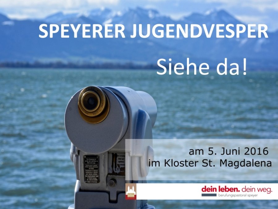 Speyer. Unter dem Motto „Siehe da“ lädt die Stabsstelle Berufungspastoral im Bistum Speyer am Sonntag, 5. Juni zur nächsten Speyerer Jugendvesper ein. Der Gottesdienst mit Pfr. Ralf Feix findet diesmal im Kloster St. Magdalena in Speyer (Hasenpfuhlstr. 32) statt und beginnt um 19.30 Uhr.