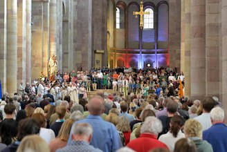 Rund 1.500 Menschen feierten anschließend im Dom gemeinsam Gottesdienst. Während des Einzugs berichteten verschiedene Gruppen von ihren Erfahrungen während der „Kreativzeit“ am Vormittag. Als besondere Gäste begrüßte Bischof Dr. Karl-Heinz Wiesemann den Ministerpräsidenten des Landes Rheinland-Pfalz, Alexander Schweitzer, sowie weitere Vertreterinnen und Vertreter der Landespolitik und der Stadt Speyer. „Wir feiern diesen Gottesdienst in ökumenischer Verbundenheit“, sagte Wiesemann mit Blick auf die Teilnahme von Kirchenpräsidentin Dorothee Wüst sowie weiteren Kirchenvertretern der Pfälzischen Landeskirche.