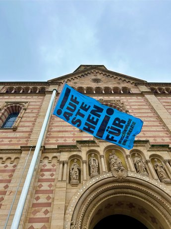 Speyer. Aufstehen für Menschenwürde und Demokratie – unter diesem Motto starteten am 17. Mai das Bistum Speyer und die Evangelische Kirche der Pfalz ihre gemeinsame Initiative. Vor dem Dom hissten Bischof Wiesemann und Kirchenpräsidentin Wüst die ersten Flaggen der Kampagne.