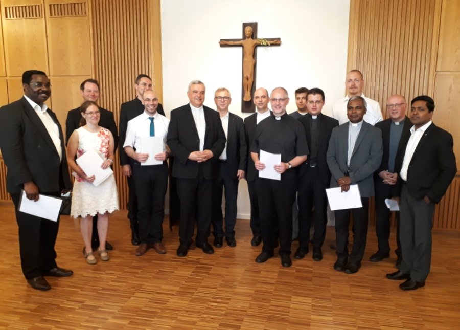 Die erfolgreichen AbsolventInnen (v. l.): Patrick Asomugha, Marianne Hetteich, Dr. Jens Henning, Dominik Geiger, Andrea Agnetta, Bischof Dr. Wiesemann, Klaudiusz Okon, Generalvikar Dr. Jung, Martin Seither, Martin Fischer, Christoph Hartmüller, Jürgen ter Veen, Pious Oroplackal, Regens Markus Magin, Tomy Kakkariyil.