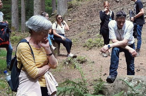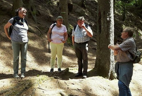 Der Goldbrunnen, ein Naturdenkmal, das einst der Gemeinde zur Wasserversorgung diente, lud ein zu einer Wassermeditation, die Cäcilia Weis, Religionslehrerin i.R. mit der Gruppe hielt. Es war eine kleine "Aus-zeit" mit diesem ganz besonderen Brunnen, die von der gesamten Gruppe genossen wurde. Zufrieden, schwitzend und leicht ermüdet kehrten die Wanderer gegen 15.00 ins Kloster Esthal zurück.